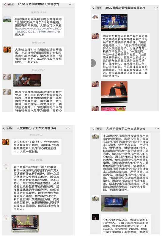 (旅游学院)2020级硕士二支部何玉霞书记组织党支部全体学生党员、入党积极分子以“线下自主学习文字材料+线下组队观看视频材料+线上讨论发言”的形式,学习周永开等7名同志先进事迹,巩固和深化“不忘初心,牢记使命”主题教育成果。倡议支部全体党员、积极分子定期学习先进典型事迹,营造向先进学习、崇尚先进的浓厚氛围,充分发挥先进典型的示范引领作用。