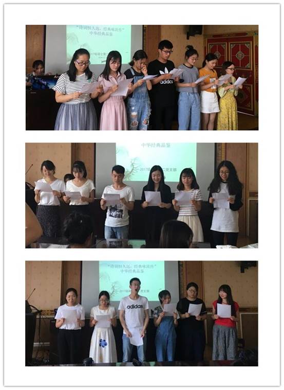 2017级硕士第二党支部在望江文科楼五楼会议室举办了“诗词恒久远,经典咏流传”的中华经典品鉴活动,本次活动旨在弘扬和传承中华民族的传统诗词文化,提升支部成员的文学素养,进而增强文化自信。参与本次活动的有支部书记何玉霞老师、支部10名党员同志以及10名入党积极分子同学。