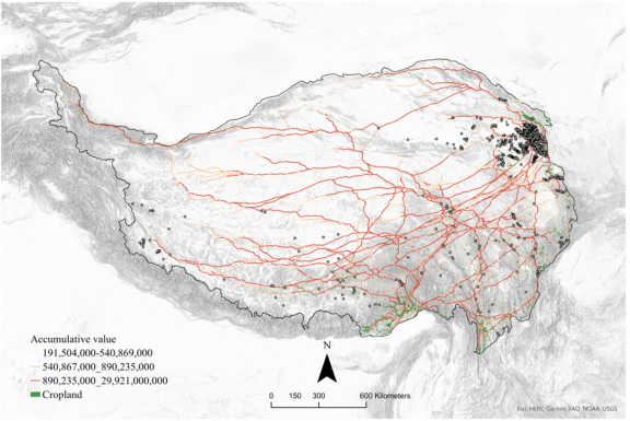基于牧民“逐水草而居“的假设,本研究中的农牧互动模型采用了卫星遥感数据库提供的植被分布数据,模拟了古人沿最好的牧草向农区移动的最优路径。这一农牧互动网络与3600-2200BP青藏高原的遗址分布高度吻合,显示理论最优的生业移动路线与聚落空间分布模式呈正相关。
