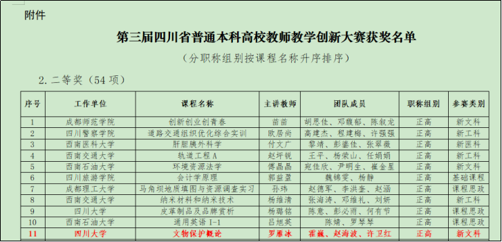 本次大赛由中国高等教育学会指导、四川省教育厅主办、四川省高等教育学会承办。我院罗雁冰老师获第三届四川省普通本科高校教师教学创新大赛正高组新文科类二等奖。