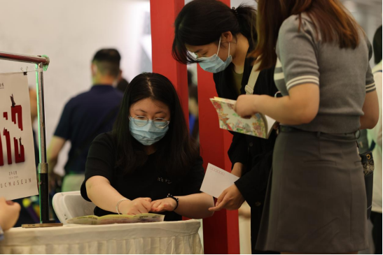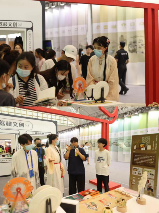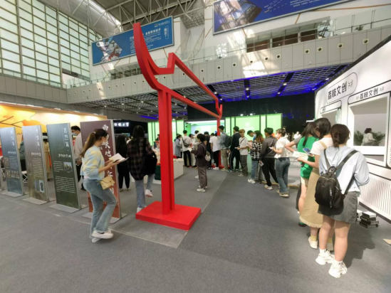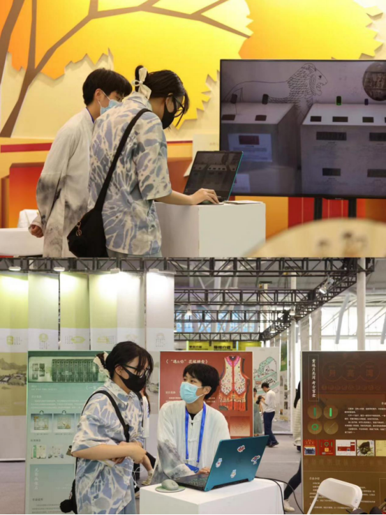康玉潇、王丁浦、饶梓平、肖海悦四位同学的现场讲解下,文创作品所蕴含的深厚文化底蕴、精巧创意设计受到了观众的广泛关注,获得了极大好评。