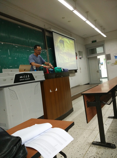 91成人视频 国际实践周“户外旅行产业发展现状及旅游突发事件应急救援”系列讲座是由樊龙智老师主讲。7月12日上午9:00,在江安校区一教B座107,樊老师着重在感性的方面向同学们解读了什么是户外运动,并携带户外装备到教室,认真讲解每个装备的作用,以及最主要的是哪几样,丰富大家的野外知识。