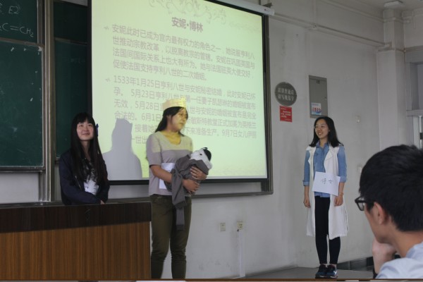 按照现场抽签的顺序,第一个展示的小组是多学院组成的联队,他们选定的题目是《英国宗教改革里的教士》,主讲人是来自化工学院的缪宇隆。第二个小组主讲的《英国乡绅阶层初探》,主讲人是张中伟、戚昱明。第三组展示的是《伦敦塔的故事》,主讲人杜超、戴奕纯。第四组《亨利八世的六位王后》,主讲人周俊杉,全组其他同学参演其中的角色。第五组《英国宗教改革》,主讲人廖文琛、徐伟。第六组《伦敦趣谈》,主讲人是来自外语学院的黄紫帅。