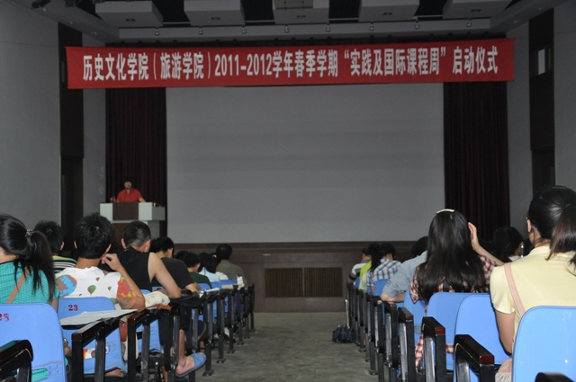 (旅游学院)2011-2012学年春季学期“实践及国际课程周”启动仪式在望江校区东三教演播厅举行。教学院长李德英教授主持仪式,副院长舒大刚教授、李志勇副教授和教师代表李原教授、董华锋博士、李晓宇博士、王玉梅老师、金培老师、李慧老师、教务李建艳老师、09级辅导员齐有明老师以及09级全体学生参加了启动仪式。