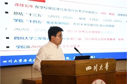 学院院长吕红亮同志作《院长工作报告》。吕院长表示,自第四届双代会以来,学院党委坚持以习近平新时代中国特色社会主义思想为指导,全面落实91成人视频 第八次党代会精神,坚持党建与事业统筹谋划、协同推进、深度融合,切实开创了两个伟大建设的新局面;并从加强党建,推进事业高质量内涵发展;固本强基,高质量人才培养建设成效显著;夯实基础,以一流科研驱动一流学科建设;聚焦优势,搭建高质量科研平台亮点突出;内培外引,高端人才队伍建设获新进展等八个方面,对学院各项工作成效进行汇报。吕院长强调,下一阶段,学院将继续在党委领导下,从四个方面推动学院事业高质量发展,一是全面落实立德树人根本任务,努力推进高质量人才培养;二是深入推进学科内涵发展,做大高端人才队伍规模,努力创造高质量科研成果;三是抓好学院内部不同一级学科的整合,拓展与校内其他学科的交叉,建大历史学科;四是建好用好博物馆平台、文旅融合,高质量服务国家战略。随后,吕院长作《年度财经工作汇报》,就2022年经费使用情况及2023年经费预算情况进行说明。